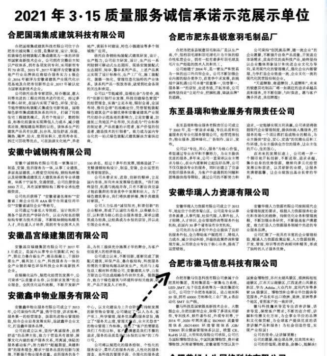 3月份由工商導報社和安徽經濟新聞網聯合發起的“2021年3·15質量服務誠信承諾示范單位”評選活動中,合肥市徽馬信息科技有限公司從眾多參選單位中脫穎而出,被授予“2021年3.15質量服務誠信承諾示范單位”,并在《工商導報》上刊登出版。